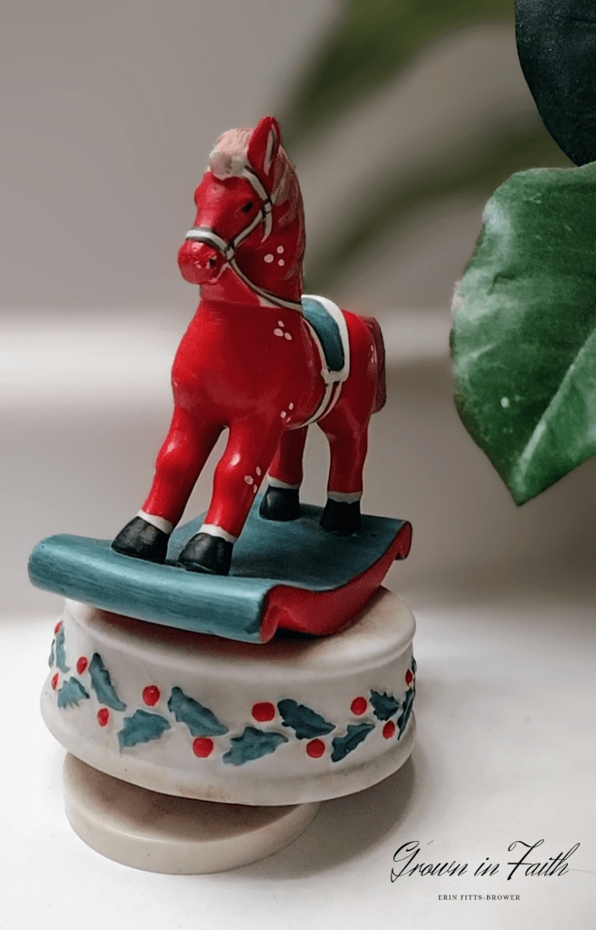 There’s a little red horse, she sits on a platform that makes her spin, as she plays pretty music. This horse has been in my family for quite some years. My grandma always sat her out every Christmas and I have always loved watching her. Though now, more than ever. Over the years she has not worked much; though tonight she plays beautifully, as she spins around, as though she had never stopped. Just like when I was a child.